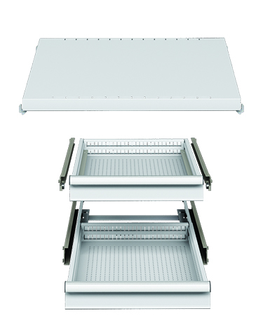 Fachböden aus verzinktem Stahlblech, 35 mm dick, höhenverstellbar im 25-mm-Raster und mit einer Tragfähigkeit von 70 kg. Schubladen 27x36 Eh mit einfacher oder Vollauszug mit einer Tragfähigkeit bis zu 100 kg.