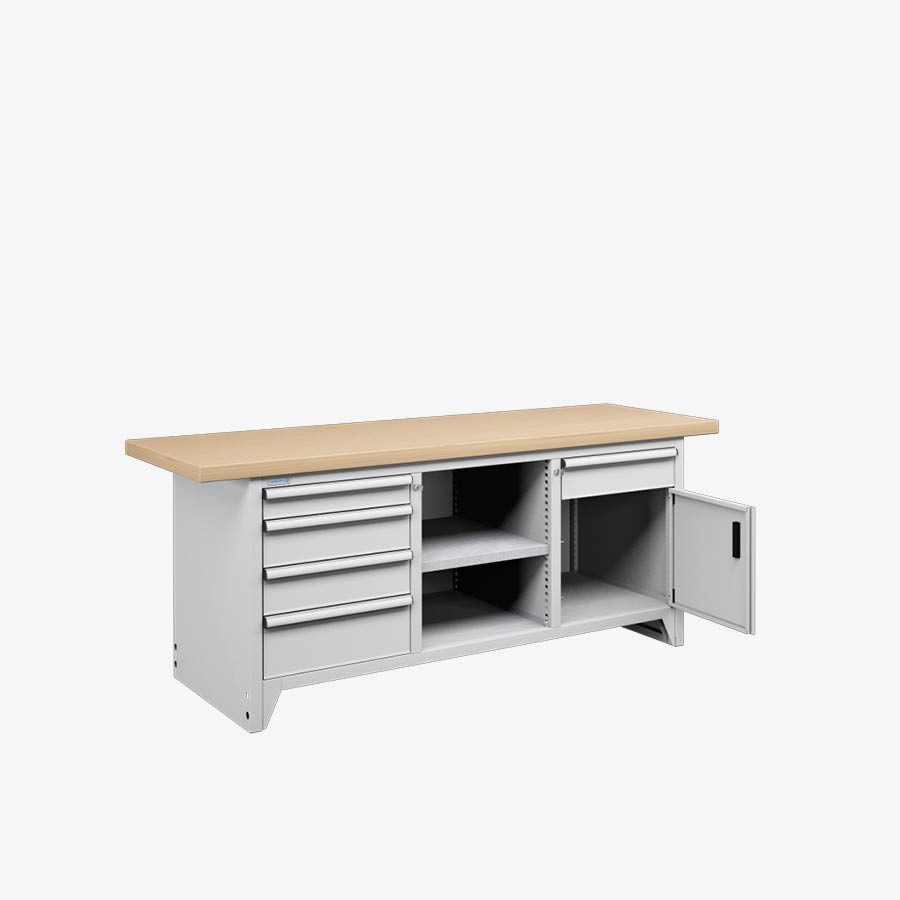 Werkbankbau aus verschweißtem Stahlblech. Wahlweise mit Multiplex- oder mit Abdeckung. Mit Zentralverschlussanlage, 2 Sicherheitszylinder und 2 Schlüssel.