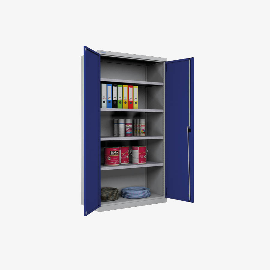 Verschweißte Konstruktion aus Qualitätsstahlblech. Zur Aufnahme von Verstellböden, Verstellbarkeit von 25:25 mm. Die Türen einschl. Verstärkungsprofil aus einem Stück schließen bündig mit dem Gehäuse ab. Wahlweise mit Sichtfenster, blendfrei aus Plexiglas® Serienmäßig mit Sicherheitszylinderschloss mit 2 Schlüssel.