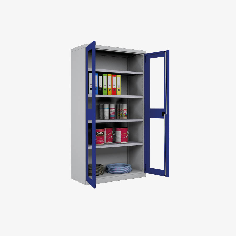 Verschweißte Konstruktion aus Qualitätsstahlblech. Zur Aufnahme von Verstellböden, Verstellbarkeit von 25:25 mm. Die Türen einschl. Verstärkungsprofil aus einem Stück schließen bündig mit dem Gehäuse ab. Wahlweise mit Sichtfenster, blendfrei aus Plexiglas® Serienmäßig mit Sicherheitszylinderschloss mit 2 Schlüssel.