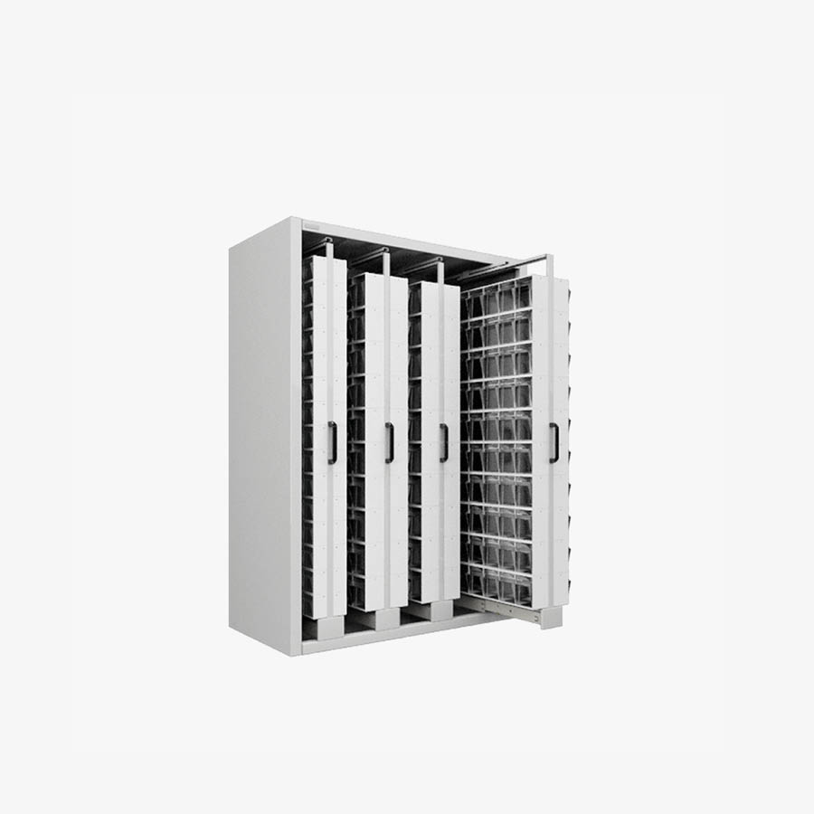 The cabinet is a formed steel structure strengthened to support heavy loads. It comes with individual drawer opening device and must be fixed to the floor or wall. Available with load capacity of 150 kg.