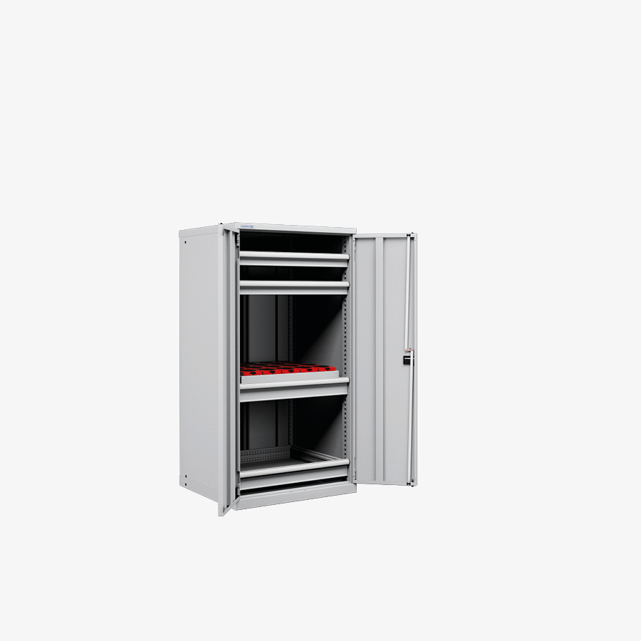Cabinet housing made of high-quality sheet steel with sides slotted in increments of 25 mm to allow drawers and shelves to be adjusted accordingly. Equipped with central locking system, safety cylinder lock with 2 keys and single drawer opening system.