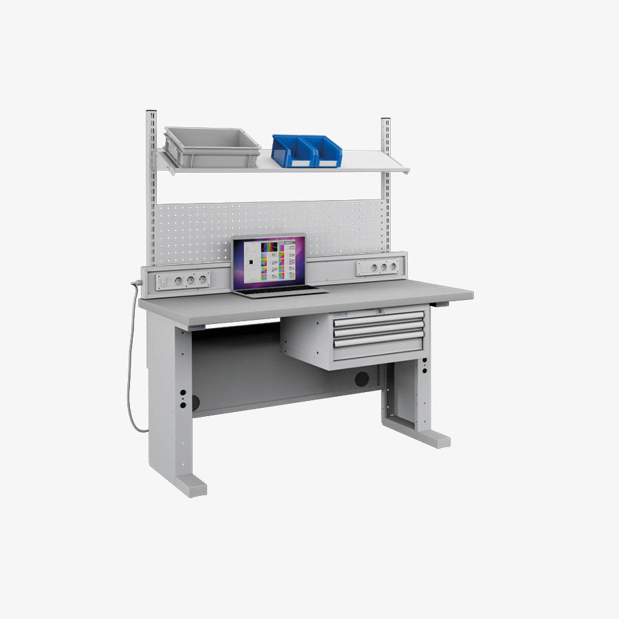 Workbench with platic laminated worktop and with maximum load capacity of 400 kg. Socket block with 6 sockets IT-DE-FR-GB. Cabinet housing made of high-quality steel equipped with safety cylinder lock with 2 keys.
