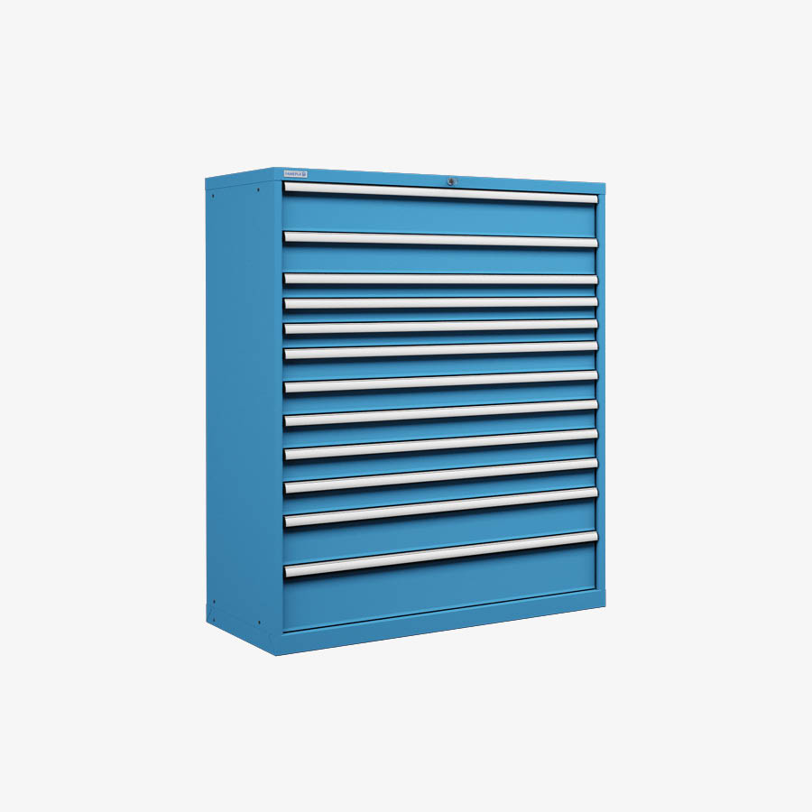 Made of high-quality sheet steel. Equipped with central locking system, safety cylinder lock with 2 keys and single drawer opening system.