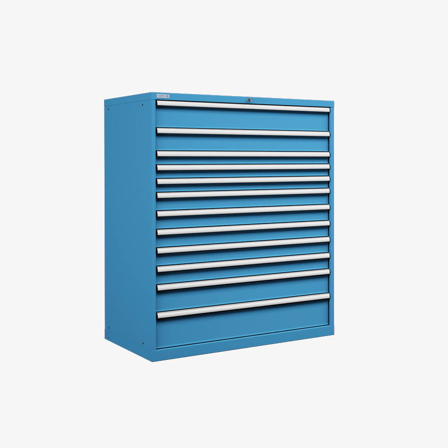 Made of high-quality sheet steel. Equipped with central locking system, safety cylinder lock with 2 keys and single drawer opening system.