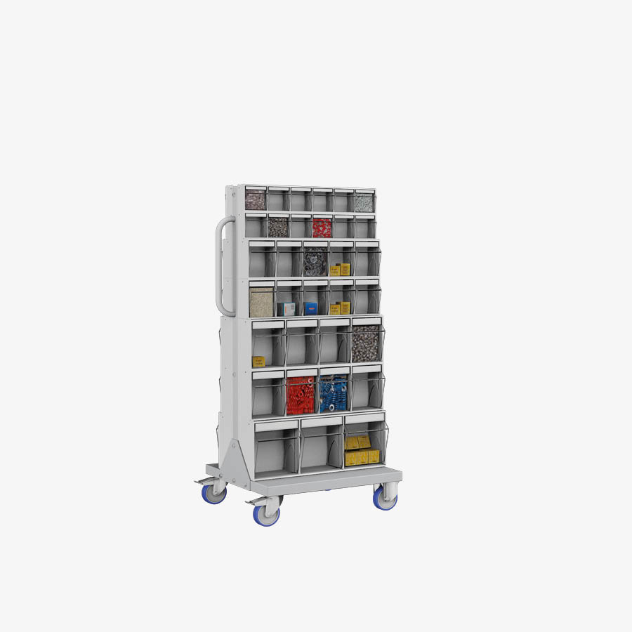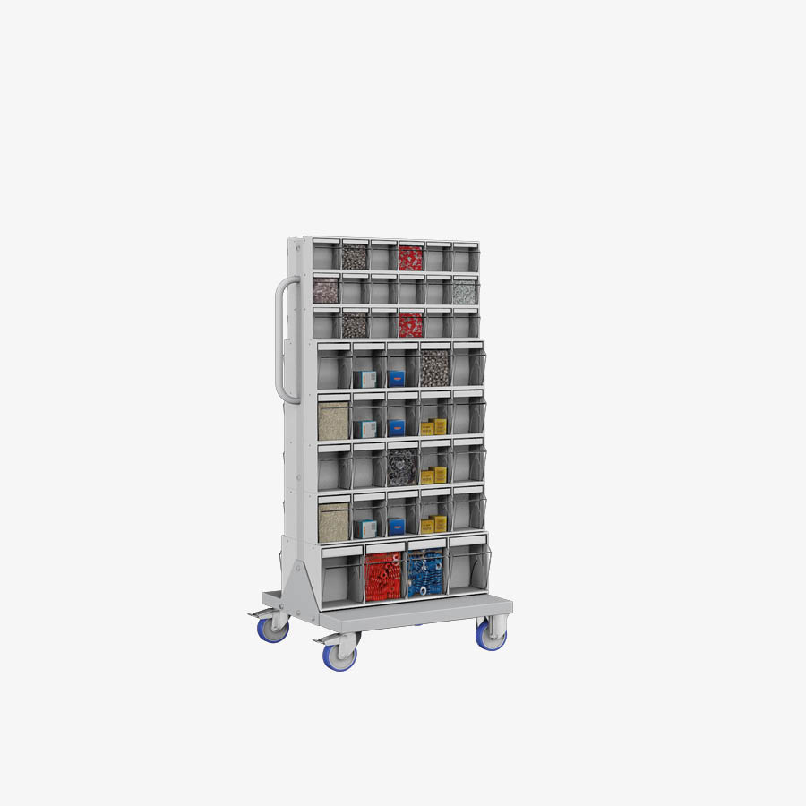Struttura in lamiera d'acciaio con maniglia ergonomica, 2 ruote fisse e 2 girevoli con freno in Poliuretano, Ø 100 mm. Portata carrello fino a 300 Kg.