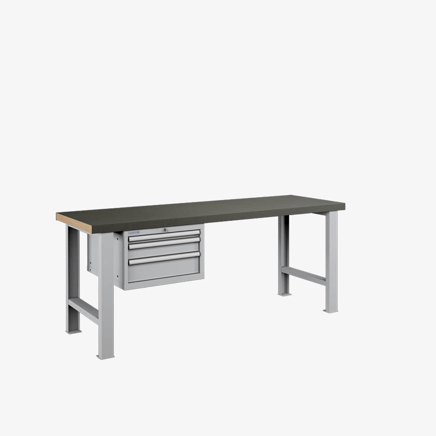 Banco da lavoro in multistrato di faggio con copertura di acciaio rivestita in gomma antiolio. Corpo armadio in lamiera d'acciaio e fornito con serratura centralizzata a cilindro.