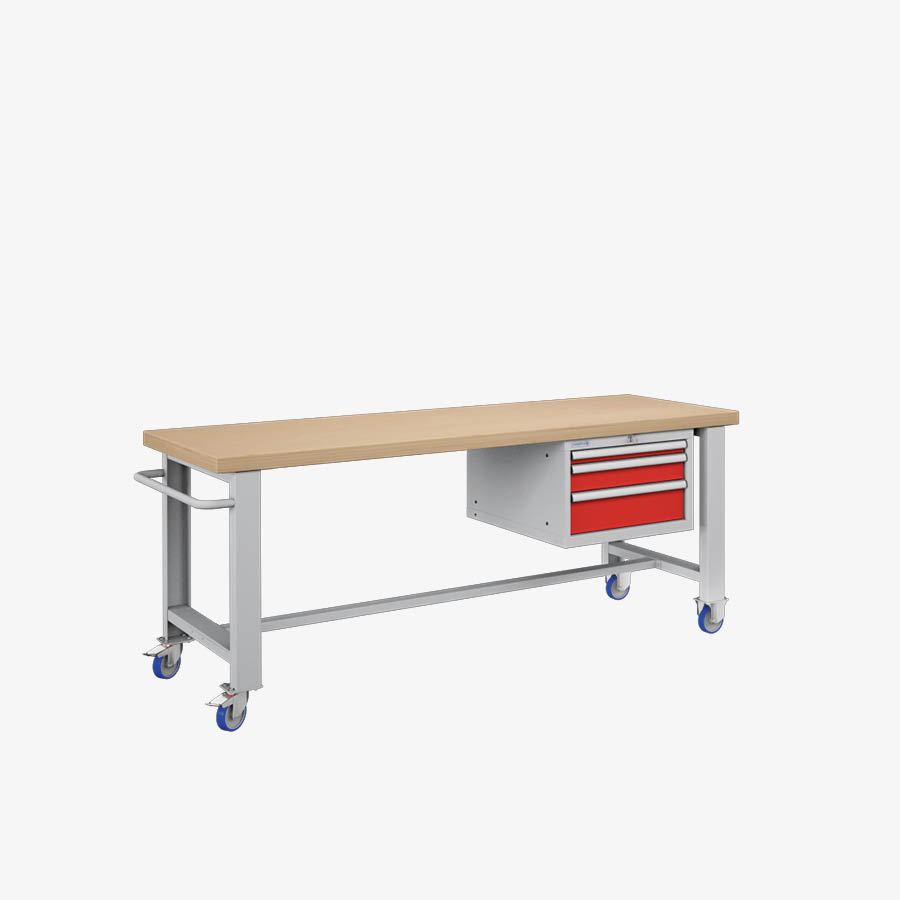 Banco da lavoro in multistrato di faggio. Possibilità di configurarlo con copertura di acciaio rivestita in gomma antiolio. Corpo armadio in lamiera d'acciaio e fornito con serratura centralizzata a cilindro.