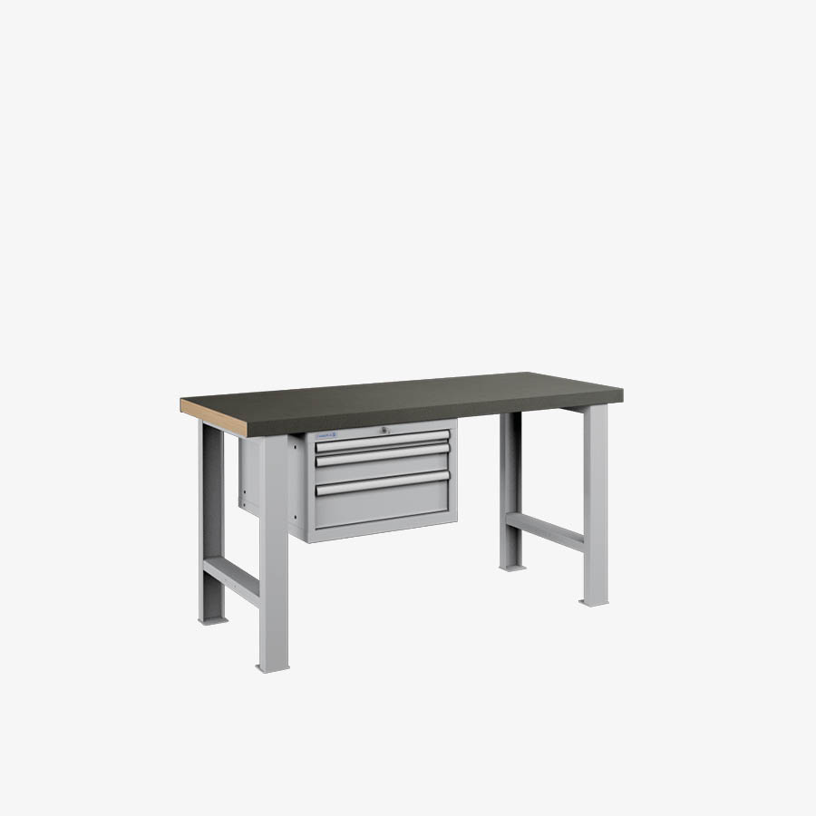 Banco da lavoro in multistrato di faggio con copertura di acciaio rivestita in gomma antiolio. Corpo armadio in lamiera d'acciaio e fornito con serratura centralizzata a cilindro.