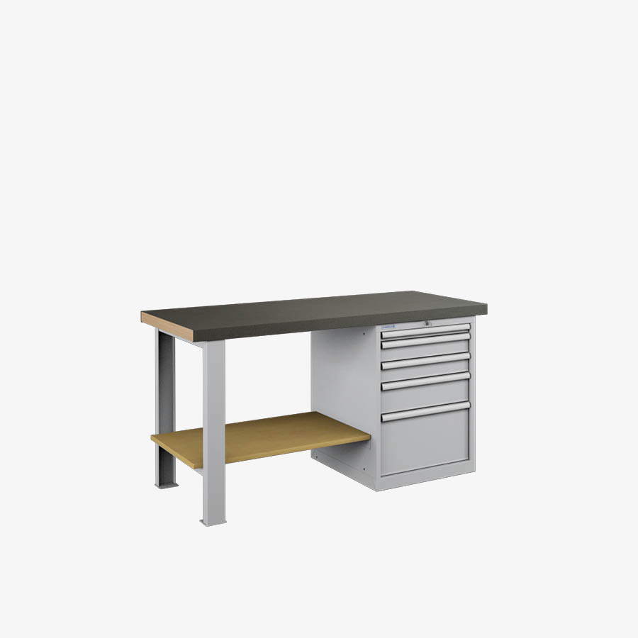 Banco da lavoro in multistrato di faggio con copertura di acciaio rivestita in gomma antiolio. Corpo armadio in lamiera d'acciaio e fornito con serratura centralizzata a cilindro.