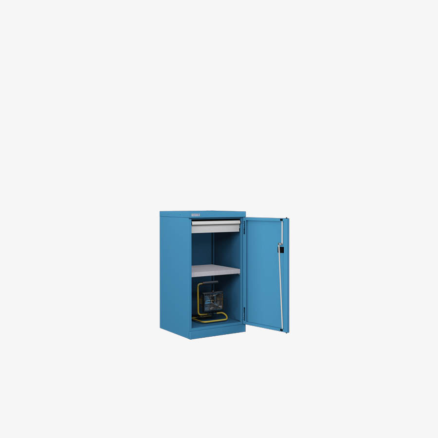 Struttura in lamiera d'acciaio verniciata. La fessurazione a passo 25 mm dei montanti interni permette il posizionamento di piani 486x500x35 mm h e cassetti 100 mm h. Porte con serratura a cilindro e 2 chiavi di serie.
