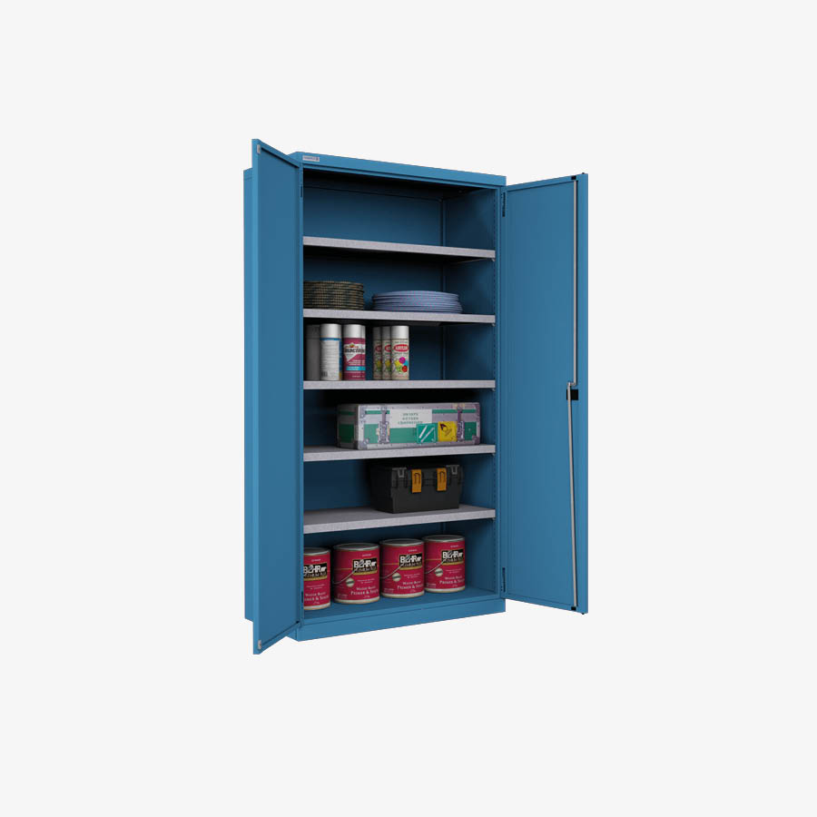 Struttura in lamiera d'acciaio verniciata. La fessurazione a passo 25 mm dei montanti interni permette il posizionamento di piani 1000x500x35 mm h e cassetti 100 mm h. Porte con serratura a cilindro e 2 chiavi di serie.